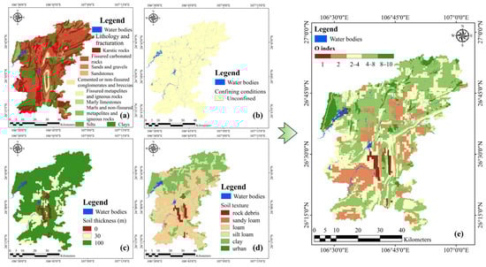 O factor and corresponding indicator distribution. (a) Lithology; (b) confining conditions; (c) soil thickness; (d) soil texture; (e) O factor distribution.