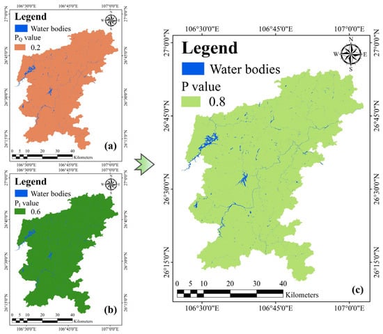 where , , and represent the distance to sinkholes, the distance to sinking streams, and the harmonized score of slope and vegetation cover, respectively.