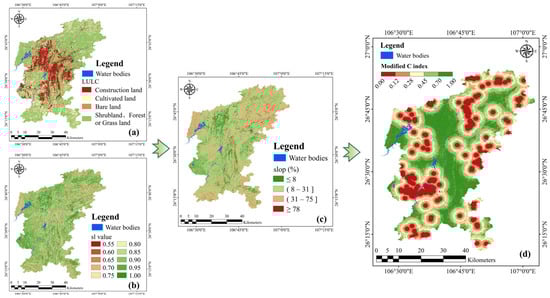 Modified indicators for new C factors. (a) LULC; (b) slope; (c) score of sl indicator; (d) modified C factor distribution.