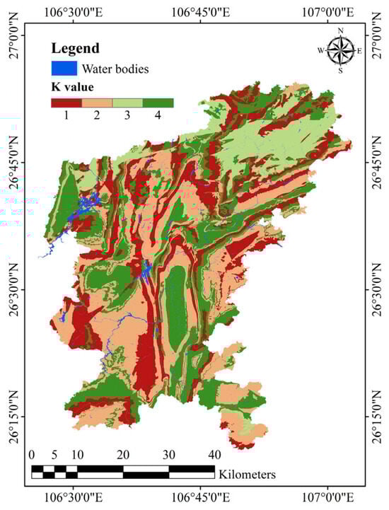 The K factor was introduced as an additional factor to represent the degree of karstification, which directly influences GV due to variations in conduit connectivity []. In this study, karst development was classified based on the Chinese standard (Code for Geotechnical Investigations of Urban Rail Transit of Guizhou Province, DBJ52/T099-2020 []). This classification standard integrates carbonate rock formations, karst development features, hydrogeological characteristics, and representative lithologies of Guizhou to categorize the K factor into three levels: strong, moderate, and poor []. These categories are assigned scores from 1 to 3, respectively, and other areas outside the classified karst zones are assigned a score of 4. The detailed classification method is provided in Appendix B, and Figure 8 shows the spatial distribution of the K factor.