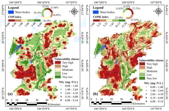 Figure 9 shows the GV mapping results derived from the COP and COPK models, respectively. The COP model was classified based on the method proposed by Vías et al. [], while the COPK model was classified using the natural breaks method. Overall, the COPK model had a large proportion of very high (27.73%) and high (27.52%) GV zones compared to the COP model, while the proportions of low (15.03%) and very low (6.33%) zones were significantly smaller than those in the COP model. Also, NO3− sampling points were shown on both GV maps. A general consistency was observed between the spatial distribution of high NO3− concentrations and the areas classified as highly vulnerable, supporting the validity of the model outputs.