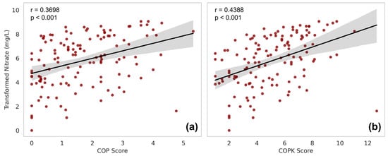 To evaluate the performance of the GV models, both the COP and the modified COPK models were compared against transformed NO3− concentrations. As shown in Figure 10, scatter plots with linear regression fits were generated for each model, and PCCs were calculated to quantify the correlations. The results indicate a positive correlation between the two models and NO3− concentrations, which confirms the reasonability of model construction. The very small p-value (p < 0.001) implies that the result is robust and unlikely to result from random noise. Notably, the improved from 0.3689 in the COP model to 0.4388 in the COPK model, which suggests that the newly introduced indicators and scoring processes such as distance to UURT, LULC, and karst development significantly enhanced the model’s accuracy in urbanized karst areas. The modified COPK model is considered more suitable for this study area and can serve as a reliable basis for future groundwater risk assessments. However, it should be noted that even after these improvements, the value remains below 0.5, which may indicate the significant influences of human activities in the study area.