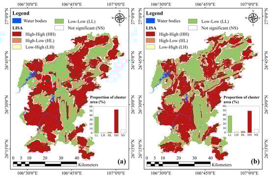 LISA mapping and spatial agglomeration: (a) COP model; (b) COPK model.