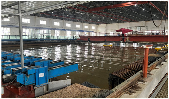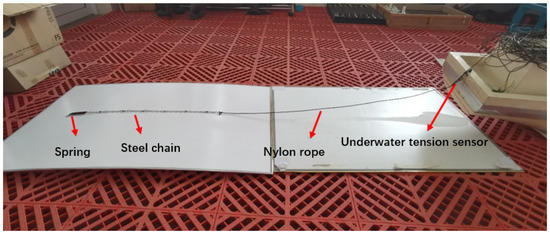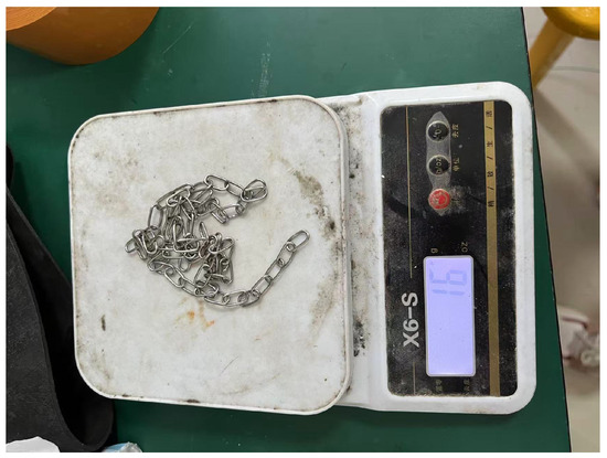 The fishing boat under investigation in this study employs a bow and stern anchoring system within port confines, as opposed to conventional alongside-wharf mooring. Figure 2 illustrates the layout of the stern mooring system. The bow mooring system mirrors this configuration identically, comprising an anchor, chain cable, and anchor rope assembly. The properties of the mooring system are detailed in Table 2. It should be noted that the scaled-down dimensions of the prototype anchor rope, derived from Froude-scaling (gravitational similarity) and geometric similarity (length scaling), are impractically small for experimental manipulation. To enhance operational feasibility, the anchor rope’s submerged weight was concentrated in the touchdown zone steel chain segment, and its elasticity was simulated via calibrated springs [31]. Similarly, for the steel chain, full compliance with diameter similarity requirements was precluded while satisfying Froude scaling (gravitational similarity) and geometric similarity (length scaling). Consequently, diameter constraints were intentionally relaxed in this study. The physical model chain implemented in the experiments is showcased in Figure 3.