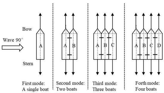 In harbor anchoring operations, fishing boats commonly adopt side-by-side tandem anchoring configurations, where adjacent boats are secured using nylon mooring cables. To restrict the relative motion between them, operational practice dictates minimizing inter-boat spacing through close-proximity coupling. This configuration, while standard in maritime operations, creates significant experimental challenges in physical model testing: the constrained interstitial space between boat models precludes the deployment of measurement instrumentation, thereby limiting quantitative investigation into gap resonance phenomena within the inter-vessel channel. Figure 4 illustrates the operational mooring configurations between boats in real-world anchoring scenarios and their corresponding experimental simulation counterparts. These models were anchored side by side to simulate single-, double-, triple-, and quadruple-boat anchoring scenarios (Figure 5). Boats were labeled sequentially from the weather side (Boat A) to the lee side (Boat D), with intermediate positions designated as B and C.