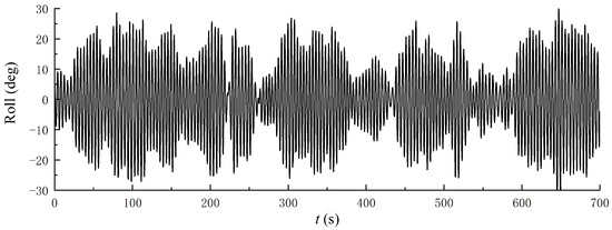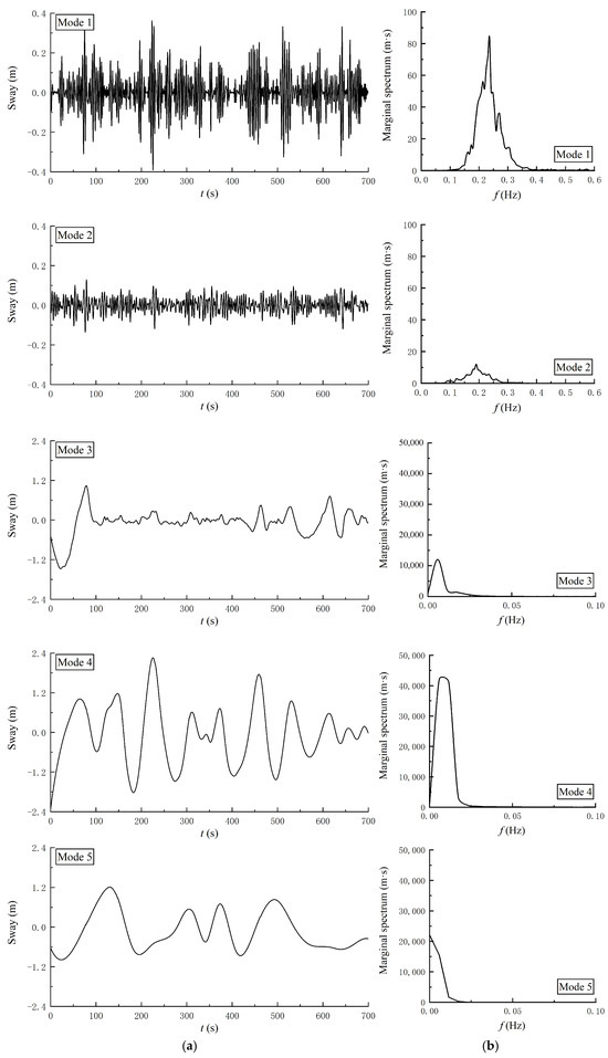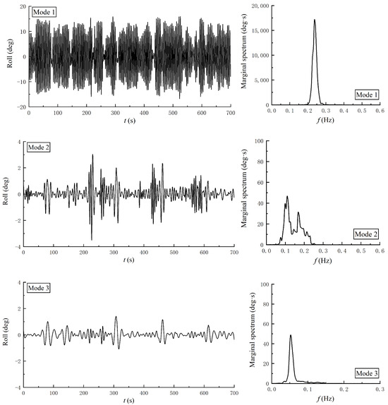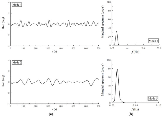 Figure 6 shows the time history of the roll motion of a single boat. After being decomposed into a finite number of intrinsic mode functions (IMFs), the initial five empirical mode components and their corresponding MHS for the roll motion of the single boat are presented in Figure 7. These visualizations are systematically arranged in descending order of the modal frequency components, ranging from the highest to the lowest frequency bands. Analysis reveals that the dominant modal frequency associated with the boat’s roll motion is primarily localized in the 0.2 to 0.3 Hz range. Notably, the spectral peak frequency corresponds closely to the designated incident wave frequency (fs = 0.25 Hz), indicating a resonant coupling between the vessel dynamics and wave excitation. Simultaneously, the wave-frequency motion response exhibits an amplitude exceeding that of all other combined modes by a factor of more than 200. In addition, the fifth empirical mode, which is concentrated in the low frequency (f = 0.011 Hz), was a little larger than other modes except Mode 1. The low-frequency components of roll motion are small but do exist, and there are no high-frequency components.
