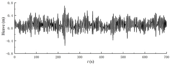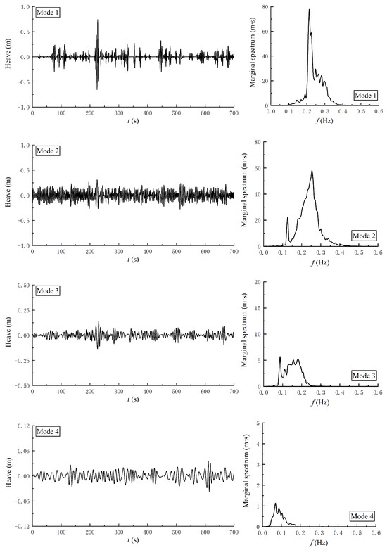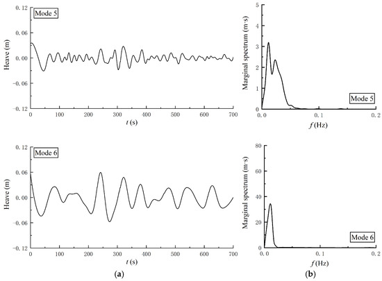 Figure 8 displays the time history of the heave motion. Figure 9 shows the first six empirical modes and the corresponding MHS. Among all the empirical modes, the amplitudes of the response in Mode 1 and Mode 2 are higher than others. Their energies are concentrated in the region of 0.1~0.4 Hz, and they also have energy concentration near the peak frequency of the incident wave. The heave motion also is dominated by the wave-frequency component. It is worth noting that there is also a significant motion response in the low-frequency shown in Mode 6. Notably absent are high-frequency oscillations within the spectral composition of heave motion dynamics.