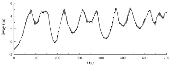 In this experiment, the fishing boat was fixed by two anchoring systems at the bow and the stern, and there were no restrictions in the other two directions. So, when the direction of wave incidence is perpendicular to the boat’s hull, the sway motion has no restoring force to return the boat to the original position, as shown in Figure 10. Figure 11 shows the first five empirical modes and the corresponding MHS. It can be seen that the larger energy amplitudes are distributed in modes 4, 5, and 3, whose energies concentrated in the region of 0~0.5 Hz. It means there are many low-frequency components in sway motion. Among them, the largest response amplitude in Mode 4 surpasses that of the wave-frequency components (mode 1) by a factor of approximately 400.