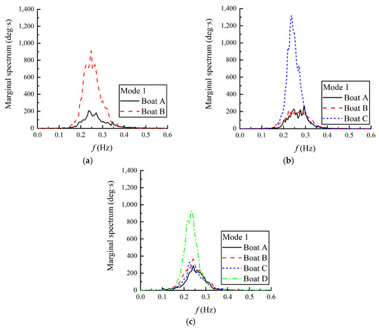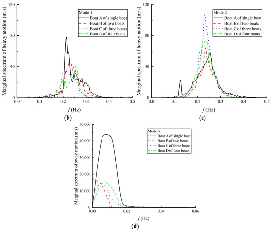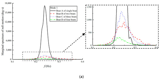 In this section, the comparisons of the DMHS of each boat, when multi-boats are anchored side by side, are analyzed. Figure 12 depicts the DMHS of roll motion for each boat. For two anchored boats, the peak value of the roll marginal spectrum of the boat on the lee side (Boat B) is about 4 times larger than that of the boat on the weather side (Boat A). Their frequency ranges are all in the range of 0.15~0.4 Hz, which is a little wider than the range of a single boat. The frequency of the energy peak is close to that of the incident wave (fs = 0.25 Hz). Similarly, for three or four anchored boats, the leeside boat consistently exhibits the highest peak in its roll marginal spectrum. Furthermore, the spectral energy of all boats is predominantly distributed within the wave-frequency band. It is obvious that, when multi-boats anchored together, the roll issue of the boat on the lee side is more sensitive to waves and deserves attention. The three-boat side-by-side anchoring configuration can be analogized to the three-square-net-cage aquaculture platform studied by Ma et al. [18]. In their research, the DMHS peaks of the leeside and central net-cage exhibited comparable magnitudes, both exceeding those of the weatherside unit. Dimensional discrepancies between the aquaculture platform and the present fishing boats, compounded by the differences in inter-structure connectivity, account for the observed response variations of each unit in the DMHS characteristics of the roll motion.
