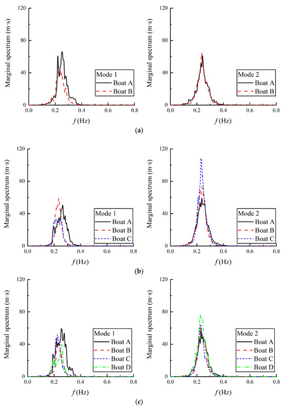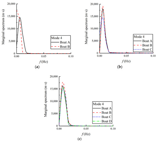 Based on the above analysis, the dominant empirical modes identified are Mode 1 of the roll motion, Modes 1 and 2 of the heave motion, and Mode 4 of the sway motion. The dominant empirical modes of these three motion components align broadly with those reported for corresponding motions in Ma et al.’s study of multi-body floating aquaculture platforms [18]. This alignment demonstrates the applicability of the present computational methodology to side-by-side anchored fishing boats. Subsequent research will focus on the MHS associated with these dominant modes, which is the dominant marginal Hilbert spectrum (DMHS).