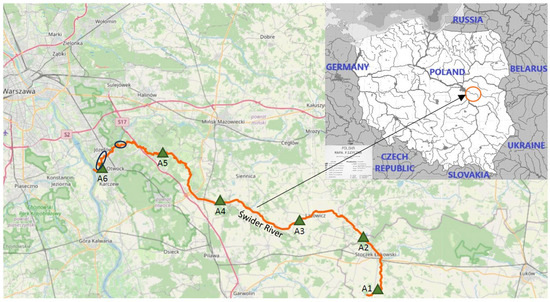 Samples were taken along the Świder River at 15 km intervals (six sampling locations A1–A6 along the entire river course) in May and August 2024 (Table 1).