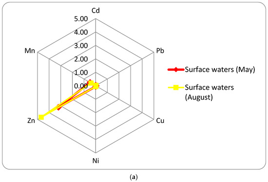 Of all environmental elements, water, as one of the main components of the environment, is most exposed to human impact [54,55]. Hence, the urgent need to protect and monitor water resources Heavy metals are among the most hazardous contaminants in aquatic ecosystems, which are distinguished from other toxic pollutants by the fact that they are not biodegradable, but only biotransformed and show high mobility in the trophic chain. Concentrations of metals in water correlate exceptionally well with pollutants of other elements of the environment located in the same geographical space. Table 6 shows the results of studies on the content of heavy metals in the surface waters of the Świder River.