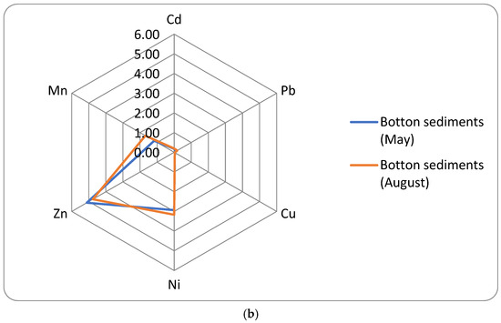 The information in Table 12 show a low level of contamination of the studied sediments of the Świder River. All values of the pollution indices were below 1. The level of contamination of bottom sediments with cadmium in the Świder River was 0.784 in May and 0.169 in August, clearly indicating a low level of pollution, with values much lower than in rivers heavily polluted by industry (e.g., the Vistula, the Elbe). The index of contamination with individual metals (Cf) ranged from 0.004 for Cu to 0.40 for Cd, indicating that none of the analysed metals exceeded the limits of moderate pollution (Cf < 1).