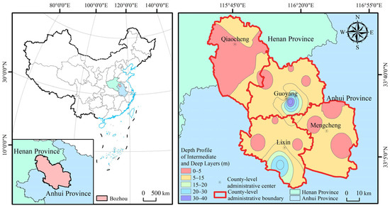 Bozhou City is situated at the southern margin of the Huang-Huai-Hai Plain, straddling the provincial boundary between Anhui and Henan in eastern China [24]. The city governs one district and three counties (Figure 1), encompassing a total area of approximately 8522.58 km2 [24,25]. Geologically, Bozhou is situated within the Huaihe Depression, a subordinate tectonic unit of the North China Platform, where fold structures and fault zones are well developed [26]. The region exhibits a predominantly flat topography, gently sloping from the northwest to the southeast. It is adjacent to alluvial fans deposited by historical breaches of the Yellow River and displays the typical geomorphological features of the Huang-Huai depositional zone [25,26].