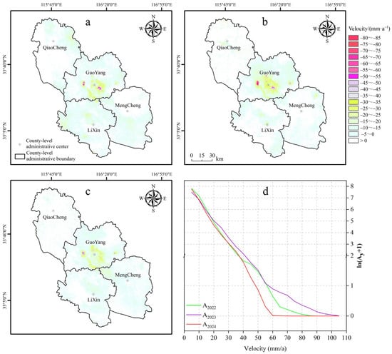 Geographic pattern of Deformation Rates in Bozhou City from 2022 to 2024: (a–c) show the geographic pattern of land subsidence rates across Bozhou City for 2022, 2023, and 2024, respectively; (d) presents the area variation across different subsidence rate intervals from 2022 to 2024, where Ay represents area (km2), y represents the year).