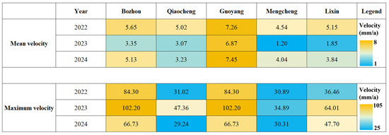 Temporally, land subsidence followed a “slow–intensification–mitigation” pattern over the three-year period. In 2022, subsidence was moderate, with Guoyang experiencing the most pronounced deformation, reaching a maximum rate of −84.30 mm/year. In 2023, subsidence intensified markedly, with the peak rate in Guoyang rising to −102.20 mm/year. Significant subsidence also emerged in Qiaocheng, Mengcheng, and other areas, accompanied by the appearance of new high-subsidence zones and rapid expansion of subsidence funnels, representing the peak deformation intensity during the study period. In 2024, although the average subsidence rate in Guoyang increased slightly, the maximum rate declined to −66.73 mm/year. Overall, both the intensity and spatial extent of subsidence showed a decreasing trend, indicating a gradual mitigation phase.