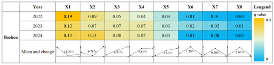 The GeoDetector results indicate the extent to which each driving factor (X1–X8) contributes to spatial variation on land subsidence in Bozhou during 2022–2024 was quantitatively assessed (Figure 4). Although minor interannual variations were observed, the overall explanatory hierarchy exhibited a clear “strong-to-weak” gradient, underscoring the multifactorial complexity underlying subsidence processes.