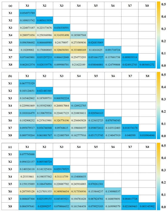 Interaction Analysis of Driving Factors for Deformation Rates in Bozhou City ((a–c) represent 2022, 2023, and 2024, respectively).