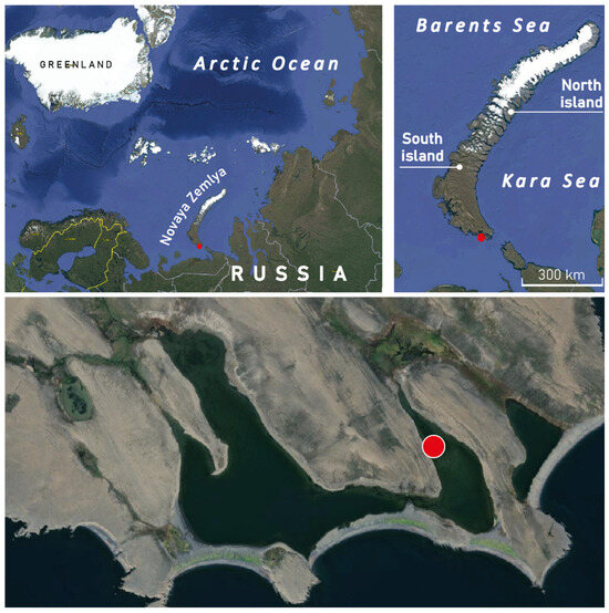 The map illustrates the location of the sampling site (red circle) in the lake situated on the Southern Island of the Novaya Zemlya archipelago.