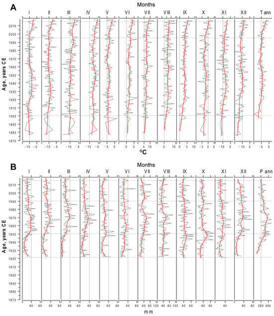 Data on (A) mean monthly and annual (Tann, °C) air temperature and (B) mean monthly and annual (Pann, mm) precipitation from the Malye Karmakuly weather station (NZ, Southern Island) (http://www.pogodaiklimat.ru/history/20744.htm; accessed on 25 March 2025). The trend lines are fitted through LOESS smoothing with a span of 0.5 (shown in red). Gray horizontal lines mark phases in temperature and precipitation records.