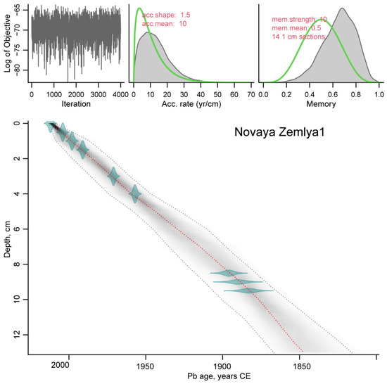 Selected sediment intervals were analyzed for 210 Pb at the Geochronology Laboratory of St. Petersburg State University. The age–depth model for the core was based on the results of the 210 Pb analysis and produced with the Bacon 2.2 package [37] with R version 4.4.2 software [38].