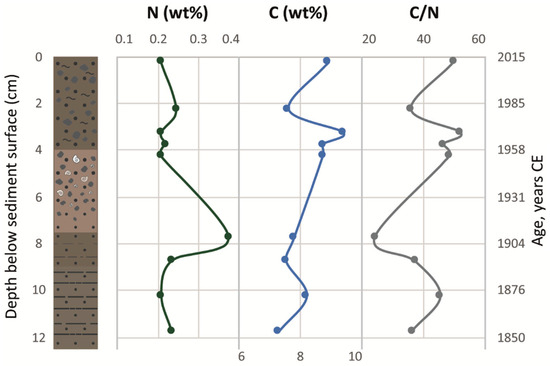 The carbon content varies slightly from 7.3 to 9.4 wt%, increasing to a maximum of 3 cm in 1971. N varies between 0.2 and 0.4 wt%. It increases from the bottom of the core up to 8 cm (1904) and then decreases. The C/N atomic ratio shows high peaks at 10 cm (1876) and 3 cm (1971); it then decreases at 2 cm (1985) before increasing again at the sediment surface. High C/N ratios indicate an increase in terrestrial influence [39].
