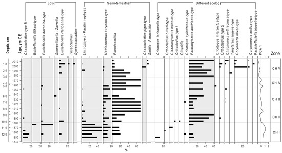 CH I (1850–1885). This zone is dominated by semi-terrestrial taxa that can also be attributed to lotic environments: Limnophyes—Paralimnophyes and Metriocnemus eurynotus-type and the semi-terrestrial taxon Pseudosmittia. The lotic taxon Chaetocladius type B has the highest core abundance (up to 15.8%). Hill’s N2 diversity reaches 5.8, which is the highest in the core.