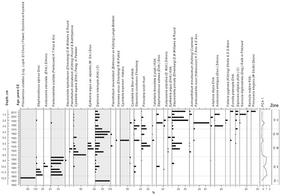 D I (1850–1860). Only two species were recorded in this zone. In the lower part of the zone, valves of the cosmopolitan, benthic, mesohalobic, pH-indifferent species Diploneis interrupta were recorded. In the upper part of the zone, valves of the planktonic freshwater species preferring oligotrophic alkaline waters, Pliocaenicus costatus, were noted.