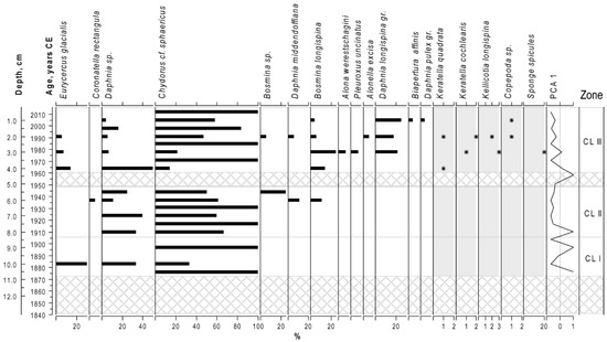 There were no Cladocera remains in the lower layers of the lake sediments between 10.5 and 12.5 cm (1850–1870). We identified three zones (Figure 7) within the cladoceran biostratigraphy (CLI–CLIII).