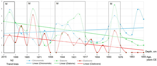 N2. Variations in N2 Hill’s diversity of chironomids, diatoms, and cladocerans in the sediment core from the studied lake (NZ, Southern Island). Rectangles marked with M indicate intervals when N2 was high for all proxies.