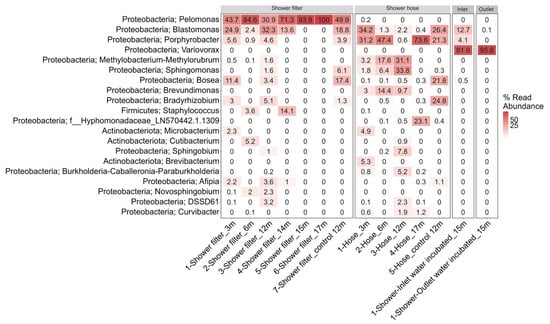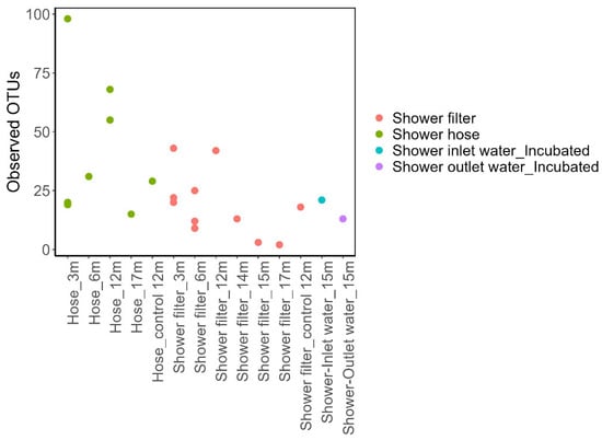Observed OTU counts were uniformly low across all four sample types (Figure 1). Richness ranged from 14–22 OTUs in the water samples. Meanwhile, biofilm samples had higher OTUs that ranged from 2–48 OTUs for showerhead filter, and 17–105 OTUs for shower hose; When comparing between different sample types, however, these differences were not statistically significant (p = 0.121, Kruskal–Wallis). This low number of taxa mirrors the low biomass measured by flow cytometry (2.5–4 log cells/cm2 on hoses; 1–3 log cells/mL in outlet water; Supplementary Figures S2 and S3) and the sparse surface of microbial cells coverage observed on shower filters by SEM (Supplementary Figure S5).