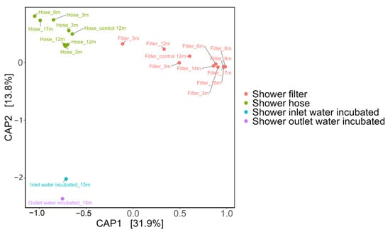 Constrained Analysis of Principal Coordinates (CAP) based on Bray–Curtis dissimilarities, illustrating distinct clustering among shower filter (red), shower hose (green), shower inlet water_Incubated (blue), and shower outlet water_Incubated (purple) samples. The first two CAP axes explain 32% and 13.8% of the total variation, respectively, underscoring how biofilm communities (hose and filter) differ markedly from one another and from the inlet/outlet water communities. Each sample was labeled with “sample type_xm” which denotes the sample type and its usage duration in months (e.g., “3m” = 3 months).