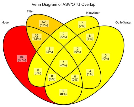 Distribution of ASV/OTUs across shower hose, shower filter, inlet water (incubated), and outlet water (incubated). Each region shows the number (and percentage) of ASVs unique to or shared by the indicated subsets. The minimal central overlap suggests that each environment harbors a largely distinct microbial community, with the hose exhibiting the highest proportion of unique OTUs.