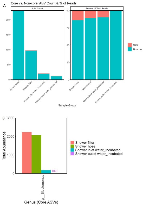 (A) Stacked bar plots showing core versus non-core ASVs among the four sample types—shower filter, hose, inlet water (incubated), and outlet water (incubated). The left panel indicates the total ASV count for each sample type, while the right panel displays the percentage of total reads attributed to core versus non-core ASVs. (B) Total abundance of the top core genus (shared by all four groups), illustrating how a single taxon dominates among the few ASVs that persist across both biofilm and water samples. BDL indicates below detection limit (zero abundance for that particular sample group).