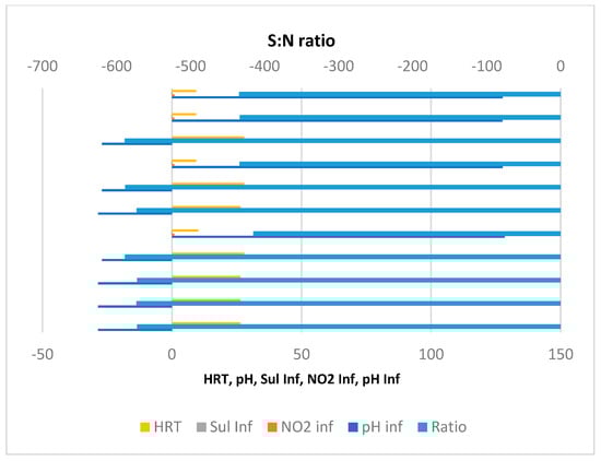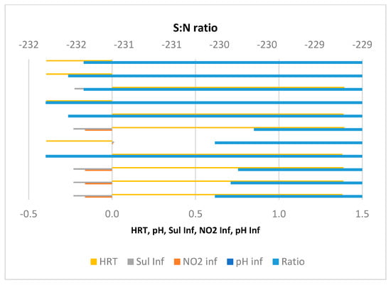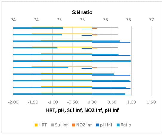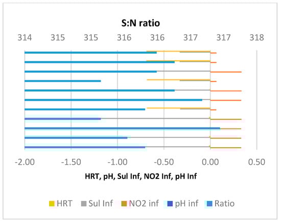 As shown in Figure 5, the S:N ratio and HRT had the highest impact on the prediction of NH4+ formation. The impact of influent pH was almost zero in this case (Table S4). From the other remaining variables, only HRT had a positive impact, which could be linked to the time of the chemical process.