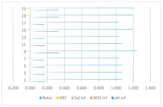 Figure 6 illustrates that sulfide and NO2- for the influent had almost no impact on the prediction of effluent pH. HRT had a small negative impact on the predictions, while the remaining variables had a positive impact on it, with the impact of the S:N ratio being the highest. Similar findings have been found for pH levels for gas treatment processes with an impact of the ratio [40].