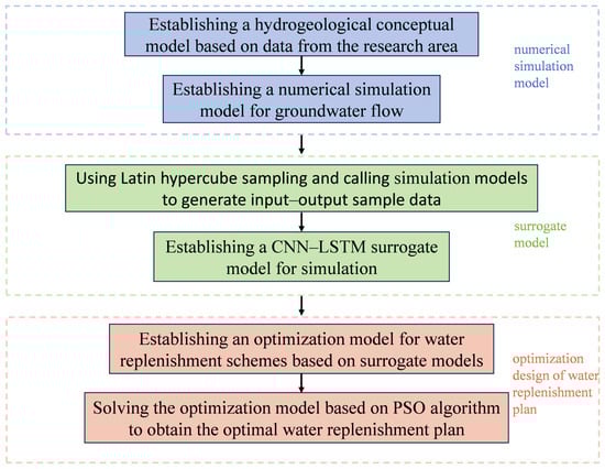 The optimization design framework for water replenishment schemes consists of three main components: the numerical simulation model, the surrogate model, and the water replenishment scheme optimization design. The framework for designing the water replenishment scheme is illustrated in Figure 1.