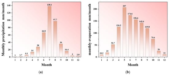 Monthly precipitation and evaporation charts of the study area. (a) Monthly precipitation in the study area and (b) monthly evaporation in the study area.