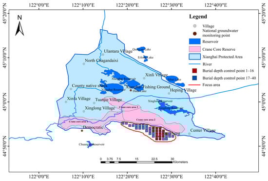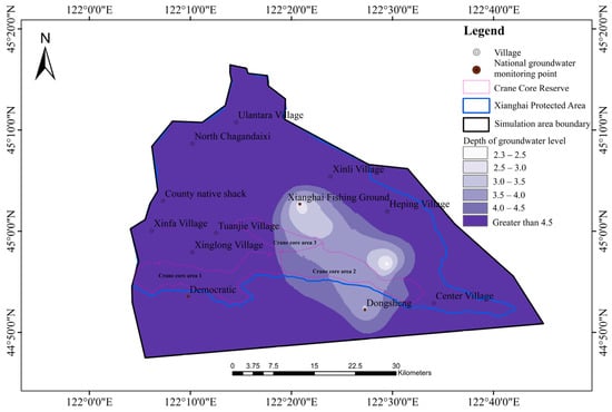 To achieve the maximum total replenishment volume for the study area while maintaining a low degree of secondary salinization in the focus area after ten years of water replenishment, the replenishment is carried out up to the maximum available water capacity. First, the maximum available water supply is selected to predict the water supplementation for zones 2 and 3 of the crane habitat. To control the extent of salinization, the area of concern is defined as the region where the groundwater depth on the southern side of the water-receiving area is less than 2.5 m after 10 years of supplementation with the maximum available water supply. By setting depth control points in the focus area, where salinization is likely to occur, the groundwater depth after replenishment is controlled, thereby controlling the occurrence of salinization. The distribution of the focus area and depth control points is shown in Figure 5.