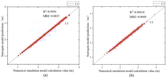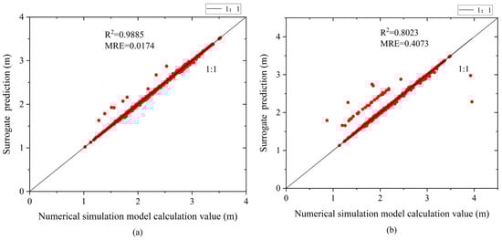 Fitting results of the Kriging model: (a) training set and (b) test set.