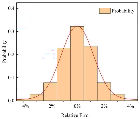 Figure 15 shows that the relative error follows a normal distribution, with a mean close to 0 and a small variance. The relative error is tightly distributed between −2% and 2%, with most of the errors concentrated around 0, indicating low dispersion. The high concentration and low variance of the data suggest that the surrogate model established by the CNN-LSTM neural network has a high prediction accuracy.