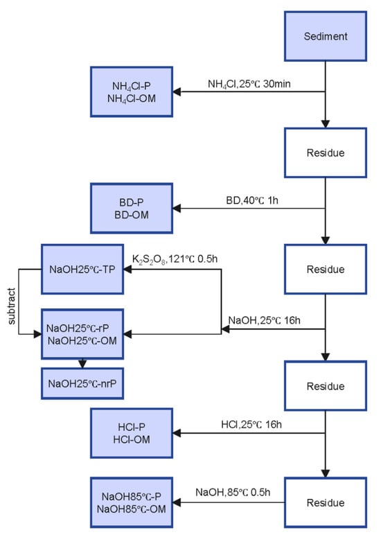 Sediment phosphorus (P) speciation was determined using the sequential extraction method originally developed by Psenner, which has been widely applied to lake sediments [23]. Briefly, 1 g of oven-dried sediment was placed into a 50 mL centrifuge tube, and extractions were carried out at a solid-to-liquid ratio of 1:50. The sequential extraction steps (illustrated in Figure 1) began with the extraction of NH4Cl-P (labile P), which was performed using 1 mol/L NH4Cl at 25 °C for 0.5 h under continuous shaking (THZ-420, GUOWANG, Changzhou, China). BD-P (redox-sensitive phosphorus) was extracted with 0.11 mol/L Na2S2O4/NaHCO3 (BD solution) at 40 °C for 1 h with continuous shaking. NaOH25 °C-rP (Al-bound P) was extracted using 1 mol/L NaOH at 25 °C for 16 h with continuous shaking. The organic phosphorus in the NaOH25 °C extract (denoted as NaOH25 °C-nrP) was quantified via the differential method. Specifically, an aliquot of the supernatant was digested with potassium persulfate (K2S2O8, 50 g/L solution, 4 mL:25 mL v/v extract ratio) at 121 °C for 30 min in an autoclave (BXM-30R, Boxun, Shanghai, China). The total phosphorus (NaOH25 °C-TP) in the NaOH extract was determined after digestion (via persulfate digestion). Then, NaOH25 °C-nrP was calculated as follows: NaOH25 °C-nrP = NaOH25 °C-TP—NaOH25 °C-rP. HCl-P (Ca-bound P) was extracted using 0.5 mol/L HCl at 25 °C for 16 h with continuous shaking. NaOH85 °C-P (residual P) was oscillated with 1 mol/L NaOH at 85 °C for 2 h with continuous shaking. The reagents used in the experiment were all of analytical purity (Jingrui AR, Yuxi, China).