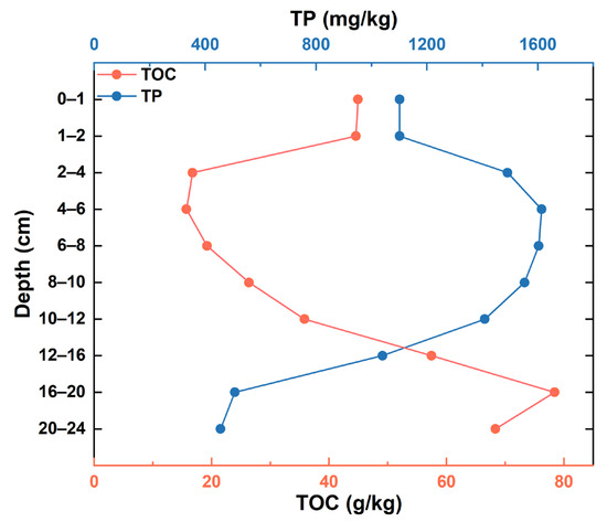 The vertical distribution of the TP and TOC concentrations in the sediment. The blue line represents the TP (mg/kg), while the red line represents the TOC (g/kg).