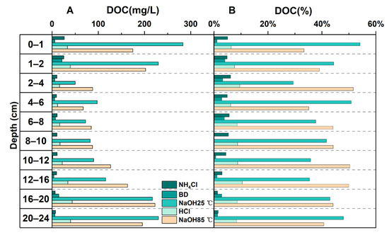 Distribution of dissolved organic carbon (DOC) and its chemical extraction fractions at different sediment depths. (A) Absolute DOC concentrations (mg/L), showing the contribution of each chemical extraction fraction at various depths. (B) Relative DOC proportions (%), illustrating the percentage variation in DOC components with depth.