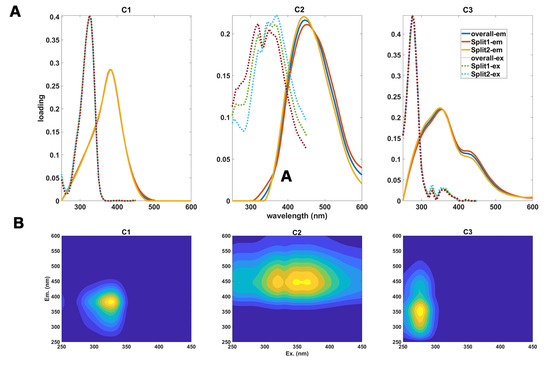 (A) Fluorescent components were detected in excitation–emission matrices and modeled by PARAFC; (B) contour plots of the three PARAFAC components (C1–C3).