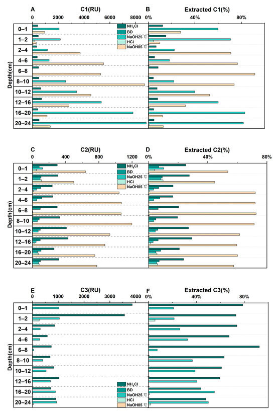 An analysis of the sequential extracts revealed that the identified fluorescent DOM components and their respective fluorescence intensities (Fmax) differed notably depending on the extraction solution employed. C1 predominated in the NaOH 85 °C and NaOH 25 °C extraction solutions, with a U-shaped depth profile observed in the NaOH 25 °C extract, whereas the NaOH 85 °C extract displayed an inverse trend (Figure 5B). C2 showed a higher fluorescence intensity in the NH4Cl and NaOH 85 °C extraction solutions compared to the other conditions, with NaOH 85 °C dominating in the deeper sediment layers (2–24 cm) (Figure 5D). C3 was primarily distributed in the NH4Cl and NaOH 25 °C extraction solutions (Figure 5F), with its relative contribution varying markedly with depth. Specifically, the C3 contribution in the NaOH25 °C extract increased from 21% to 50%, while it declined from 79% to 48% in the NH4Cl extract.