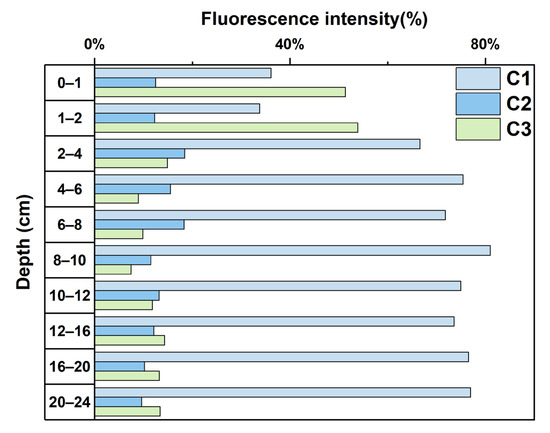 Relative fluorescence intensity (%) of three FDOM components (C1, C2, and C3) at different sediment depths.