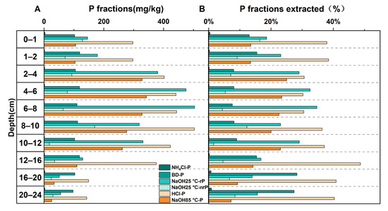 Vertical distribution of P fractions in lake sediments. (A) Absolute concentrations (mg/kg); (B) relative percentages of extracted P fractions.