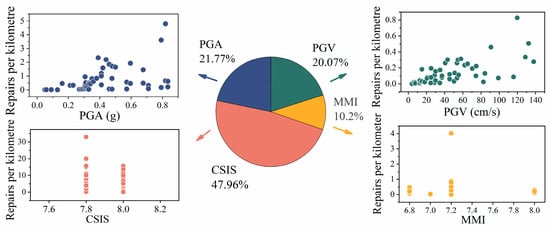 - The classifications of seismic intensity used in different countries are generally different. Therefore, to avoid the need for conversion between different national intensities when using earthquake disaster prediction models, it is not recommended to use national seismic intensities, including MMI and CSIS, to express seismic strength. It is worth noting that some sample points express seismic strength using the CSIS scale, providing additional valuable information, such as pipe diameter. These sample points support further investigation into other factors affecting the pipeline repair rate.