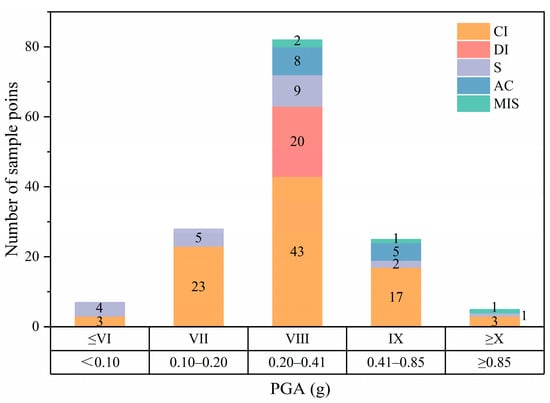 Following data screening and adjustments, this study retained 208 sample points from 18 seismic events. According to the correlation between seismic intensity and peak ground acceleration (PGA) specified in the “Chinese Seismic Intensity Scale (GB/T 17742-2020)” [], the PGA values were classified into five intervals: ≤0.01 g (≤Intensity VI), 0.01–0.20 g (Intensity VII), 0.20–0.41 g (Intensity VIII), 0.41–0.85 g (Intensity IX), and ≥0.85 g (≥Intensity X). This classification scheme was adopted to better characterize the distribution patterns of the sample data across different seismic intensity levels.